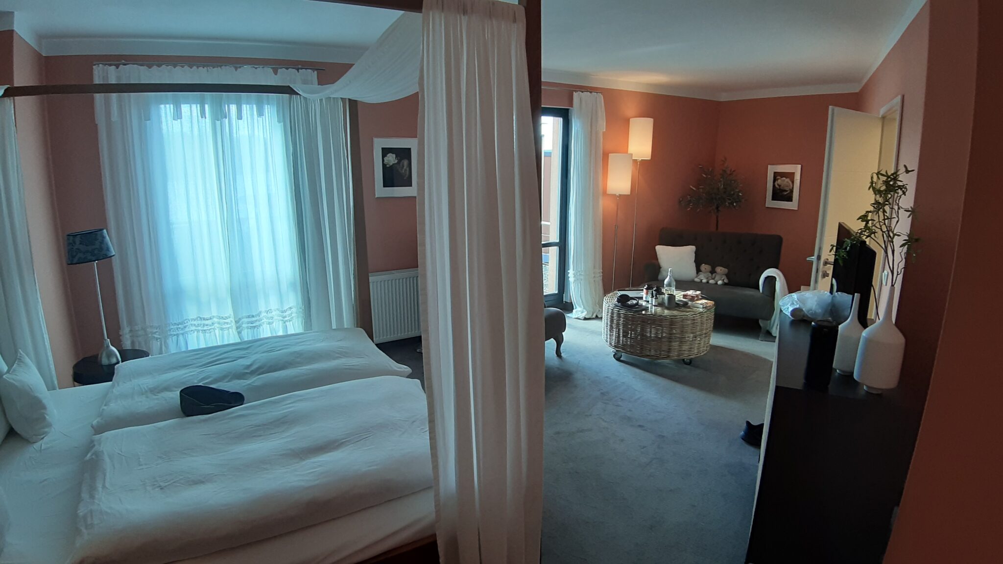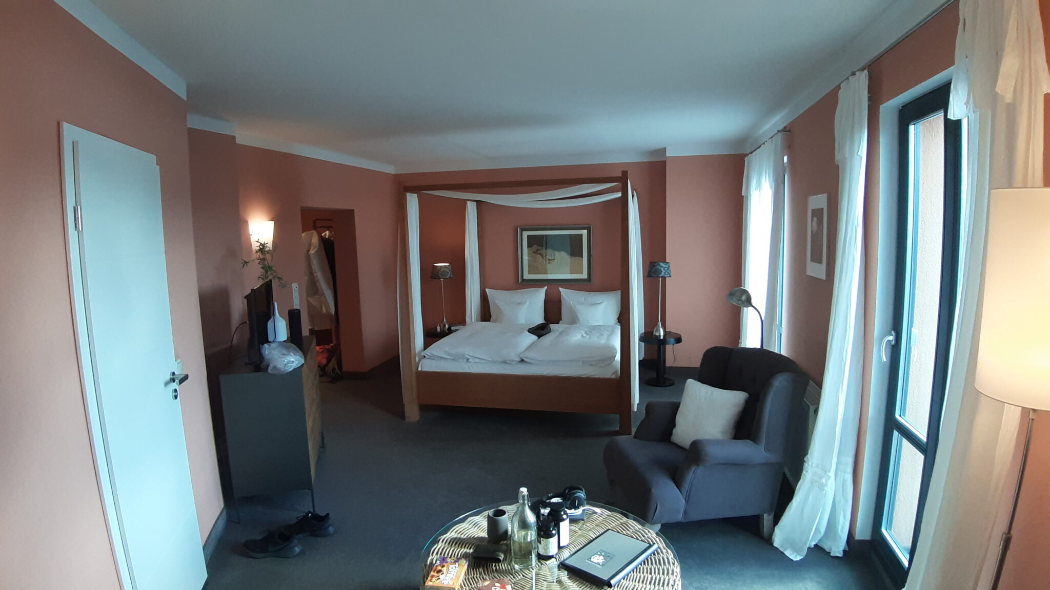 Der Vollmond leuchtet hell über uns, als wir unsere Sachen durch die kleine Straße zum Hotel trugen. Wir sind Freitag bereits angereist, um noch in Ruhe zu Abend zu essen, bevor wir in ein ruhiges Wochenende starten. Leider konnten wir aufgrund von Personalmangel nicht im Hotel essen. Trotzdem hat es uns das Zimmer sehr angetan: Viel Platz, schönes Badezimmer, eine riesige Terrasse mit Blick auf den See und ein Himmelbett (für Sarah).