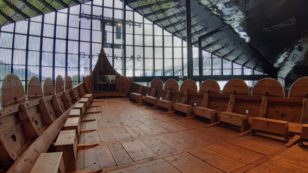 Wir besuchten das Sagastad Museum, in welchem Myklebust ausgestellt wird. Der Eintritt war mit 17 Euro pro Kopf zwar recht happig, dafür konnte man das Wikingerschiff anfassen, betreten und praktisch auseinander nehmen. Typisch norwegisch war auch die Ausstattung: Audioguide als App auf deutsch, gratis WLAN, Videowände, VR Equipment und ein Shop mit brauchbaren Waren. Zwei Tassen und ein Regenhut wurden unsere ersten Mitbringsel.