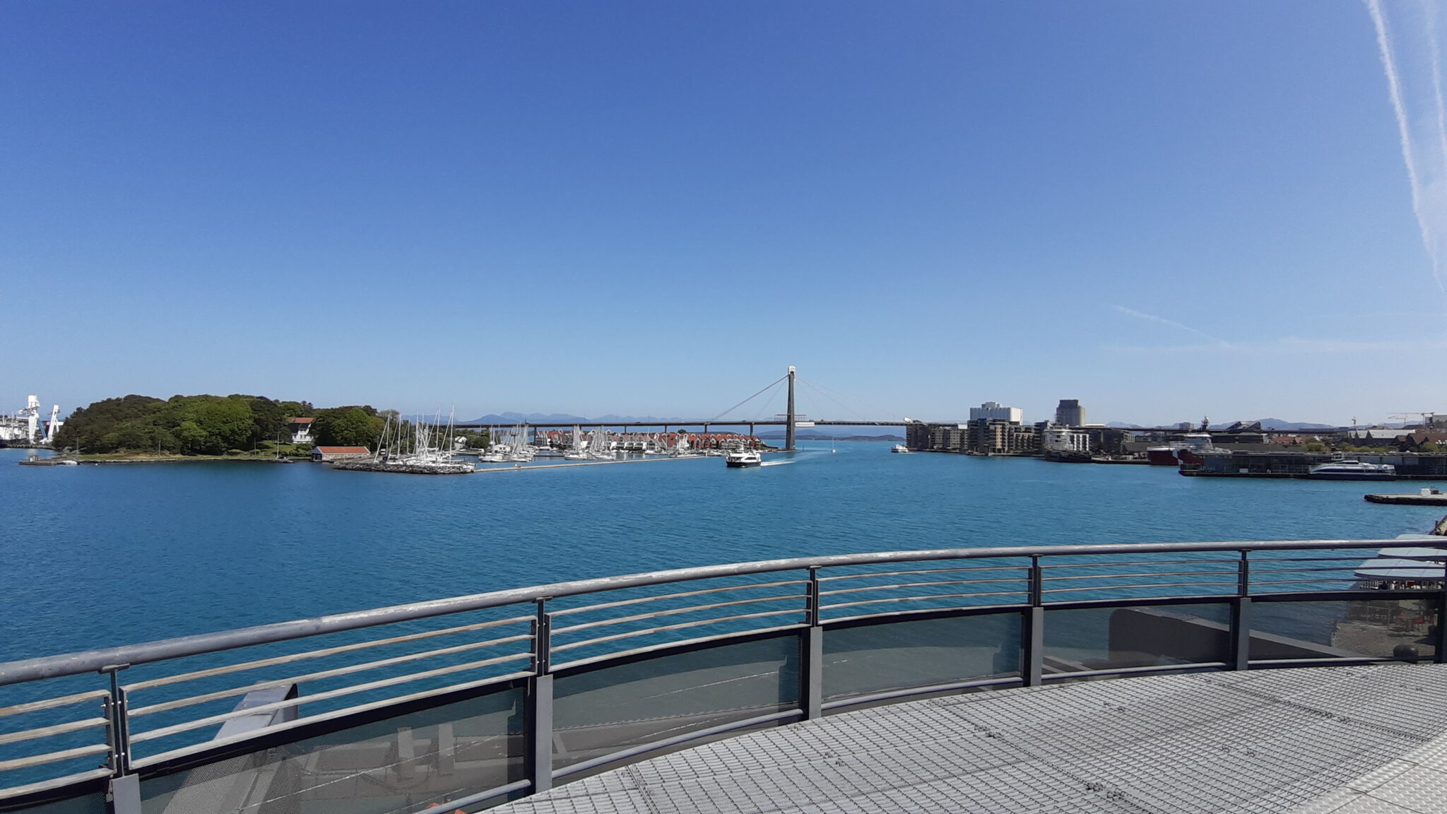 Ein leichtes Frühstück später packten wir unsere Rucksäcke und verließen das Schiff über Deck 3. Gleich am Ende des Piers wartete der Hafen mit Stadtplänen und Souvenirshops auf. Von hier waren es nur etwa 15 Fußminuten in das Stadtzentrum, also los und über die Brücke auf das Festland.